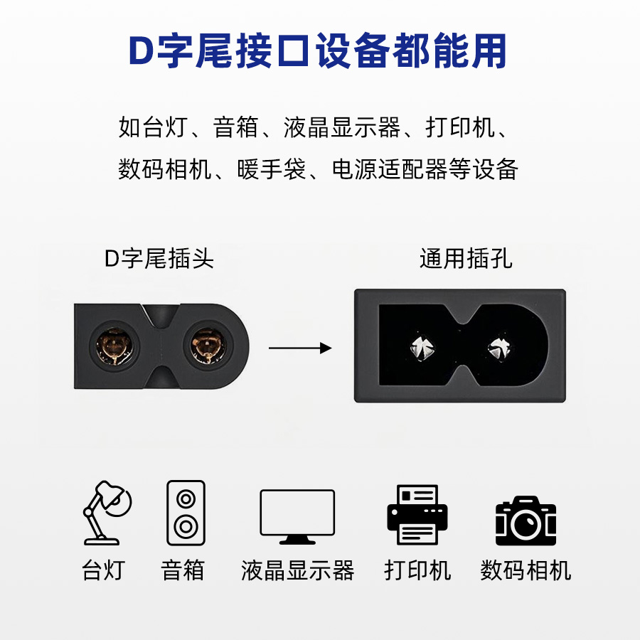 D字尾设计:通用D字尾接口设备都能用,如音响、显示器、打印机、数码相机、暖手宝、电源适配器等
