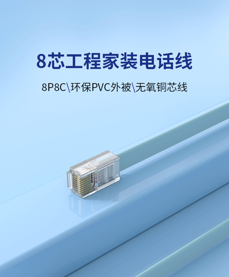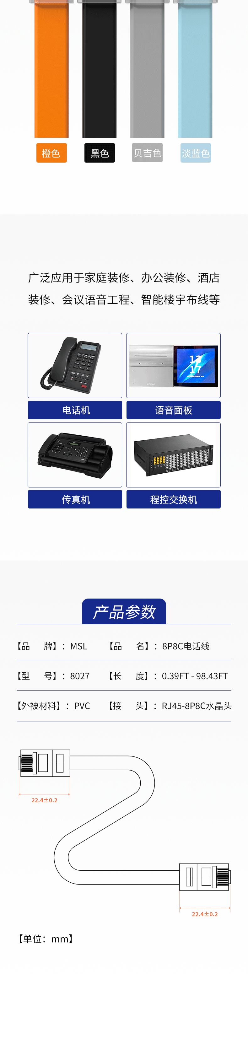 MSL八芯电话线8027是一款适用于家庭和办公使用的RJ 45高性能8P8C网络连接电话线。8027采用无氧铜导体线芯,镀金触点,具备良好的导电性能和传导性能,能够有效提升信号传输的稳定性和速度,扁平柔软线身,收纳方便易弯折方便布线,适用于家庭装修、办公装修、酒店装修、会议语音工程、智能楼宇布线等即插即用,便捷舒适。