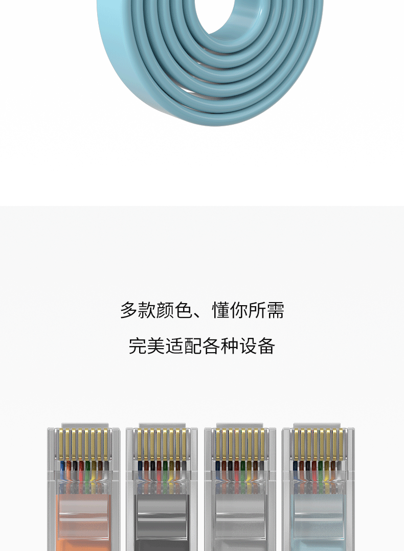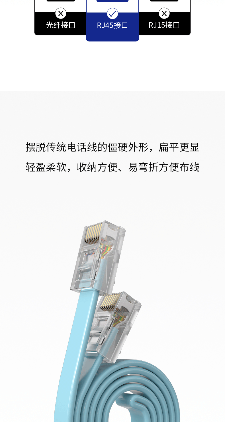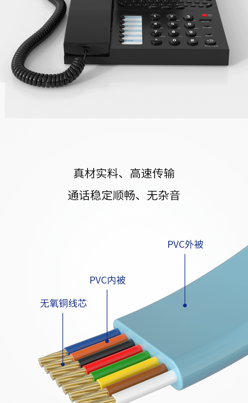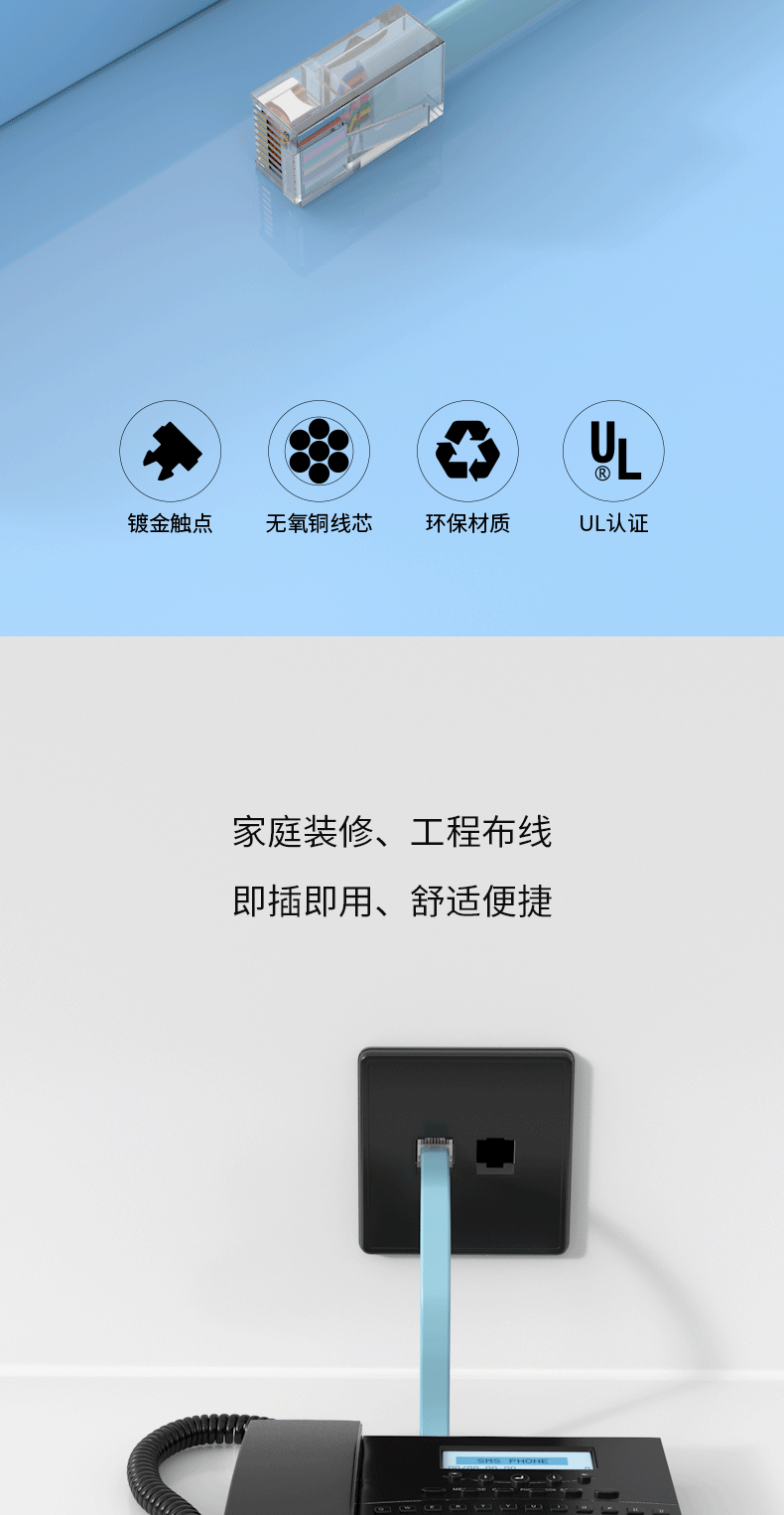 扁平线身:摆摊传统电话线的僵硬外形,扁平更显轻盈柔软,收纳方便易弯折。