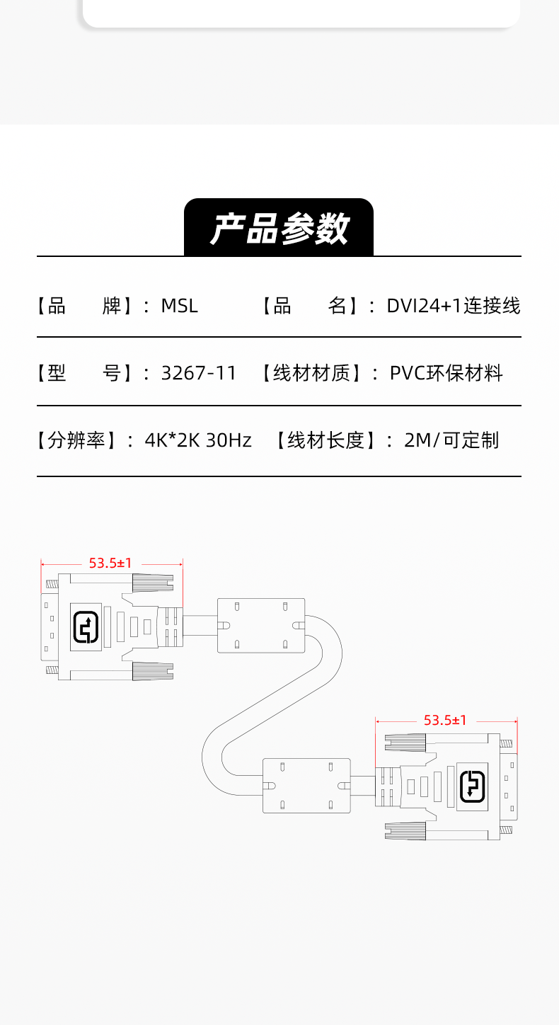 MSL信号线DVI25 M - DVI25 M是一款适用于家庭和工程使用的高性能DVI连接线。3267-11采用铁壳镀金24+1公对公双通道3480*2160高清分辨率,画质细腻逼真,饱和度高,刷新速度快。接口采用镀金工艺,耐腐蚀抗氧化,长久使用信号依旧稳定传输,适用于带有DVI24+1接口的设备连接。