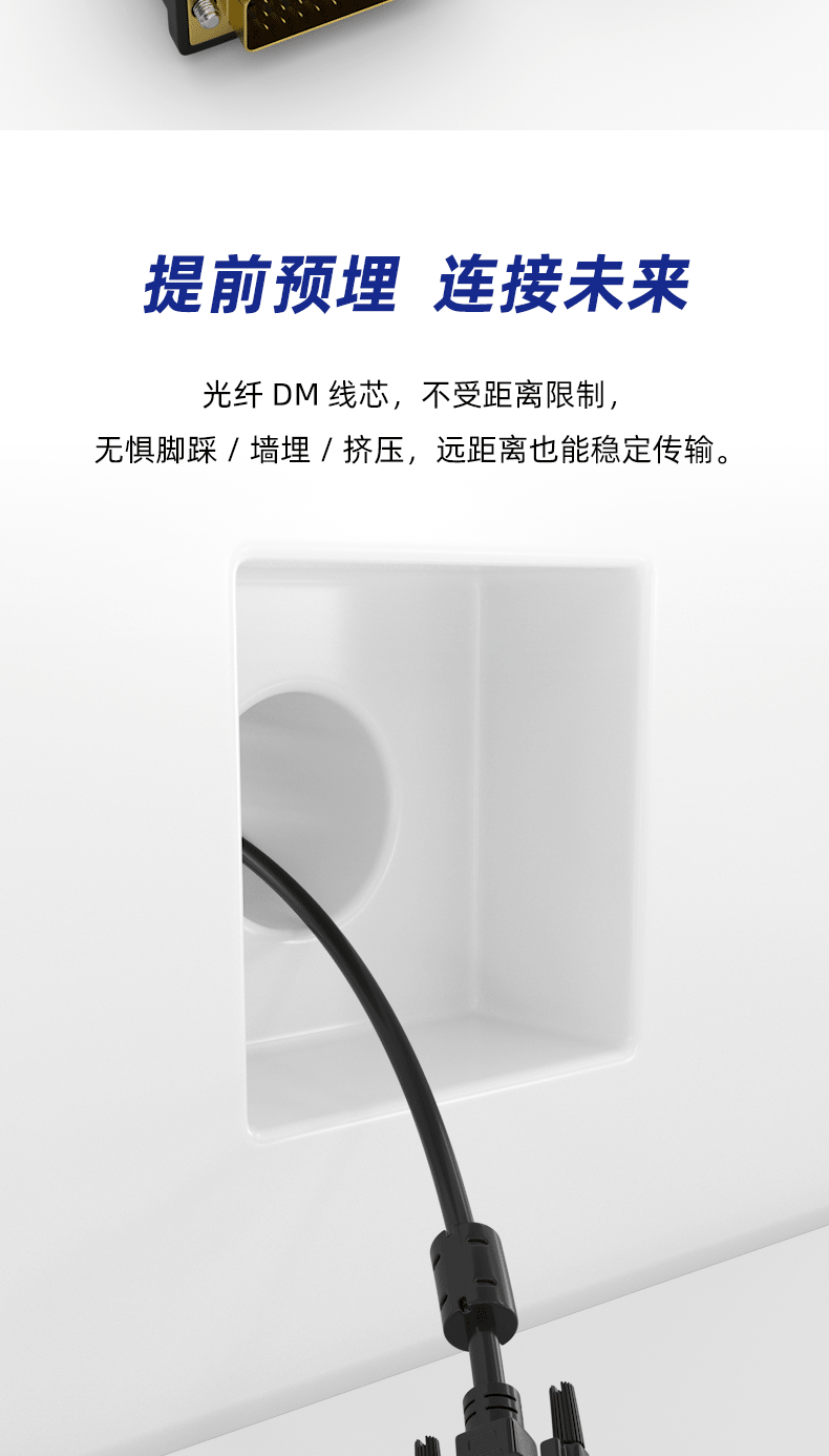 提前预埋:光纤DM线芯,不受距离限制,无惧脚踩、墙埋、挤压,远距离也能稳定传输