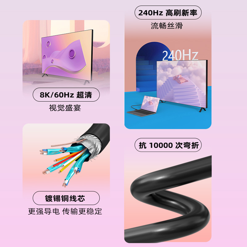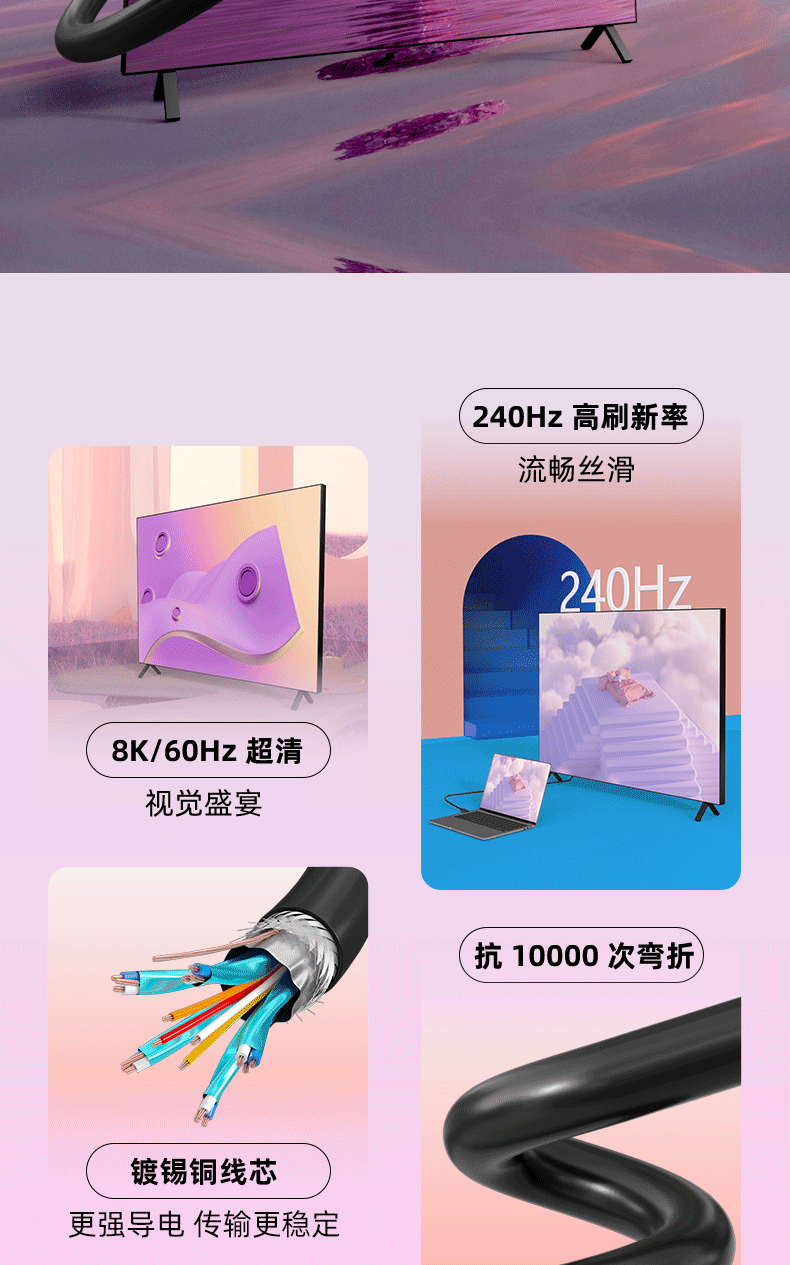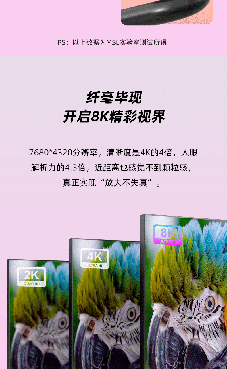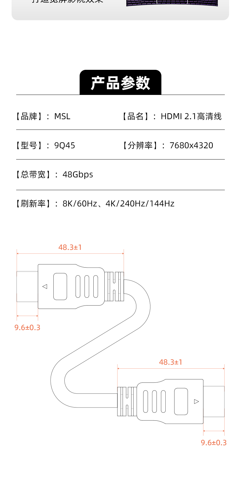 MSL高清数字HDMI 2.1 8K电脑电视显示器屏连接线投影仪视频线9Q45是一款高品质、高性价比的线缆,支持8K超高清分辨率传输,满足各种场景需求,工程级品质保证稳定传输,高清画质无论是观看电影、玩游戏,还是进行工作演示,都可获得更加细腻、逼真的视觉体验,广泛兼容性适用所有设备,易用性设计让连接更简单。适合影视发烧友、游戏玩家、家庭用户和商务工作演示等场景。