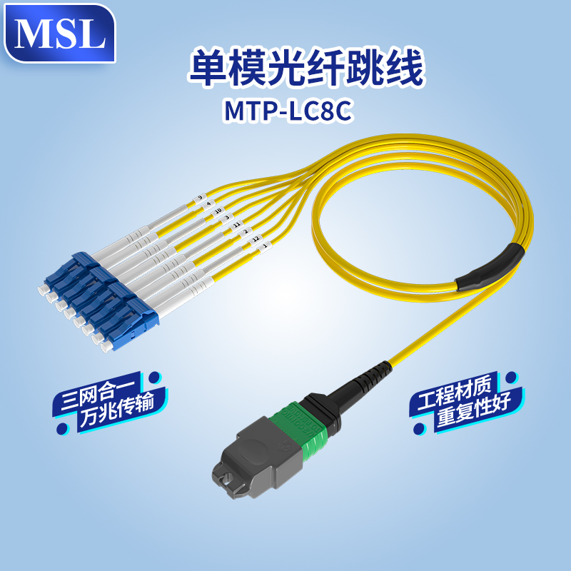 MSL单模MTP-LC光纤跳线,采用高性能纤芯G657A1,兼容性广泛光损小,设计用于高速教据传输和光信号传输,适用于多种网络和设备连接。支持室内外布线需求,适合多种光纤通信系统、光纤传感系统、数据中心、局域网(LAN)、光纤到户(FTTH)、工业控制系统以及智能监控系统等应用场景。