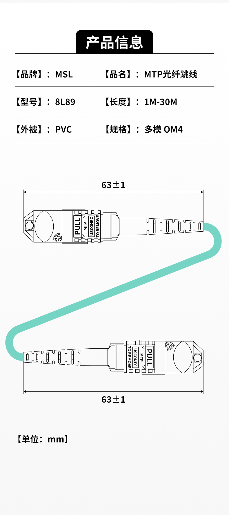 MSL多模OM4光纤跳线产品8L89,兼容性广泛,适用于多种网络和设备连接。支持10Gbps万兆传输,确保高速稳定的数据流动,设计用于高速教据传输和光信号传输。支持室内外布线需求,适合多种光纤通信系统、光纤传感系统、数据中心、局域网(LAN)、光纤到户(FTTH)、工业控制系统以及智能监控系统等应用场景。