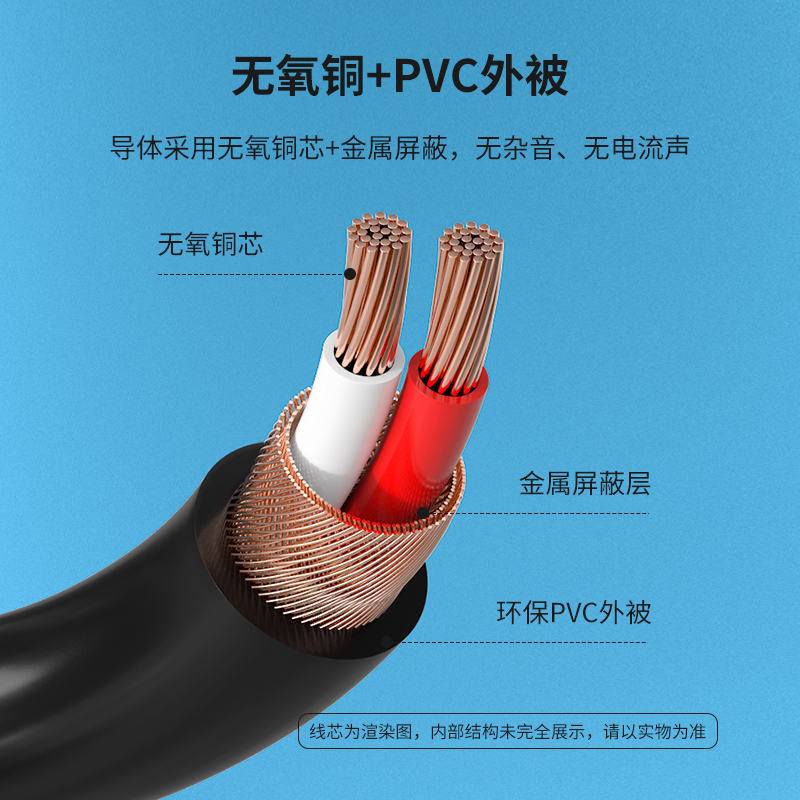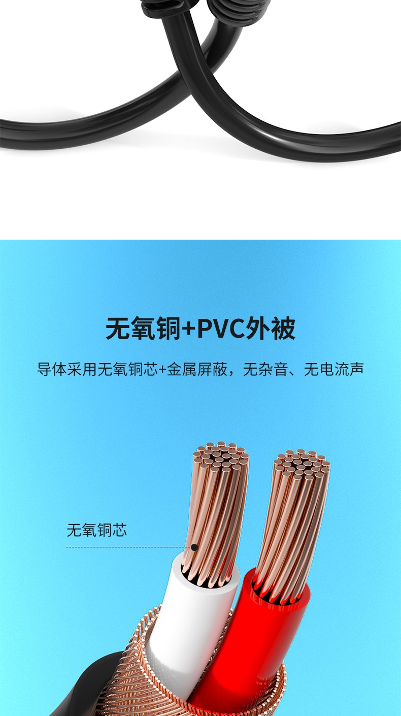 双层屏蔽:无氧铜线芯+金属屏蔽层,有消抵抗电磁干扰,无杂音、无电流声,高保真音质。